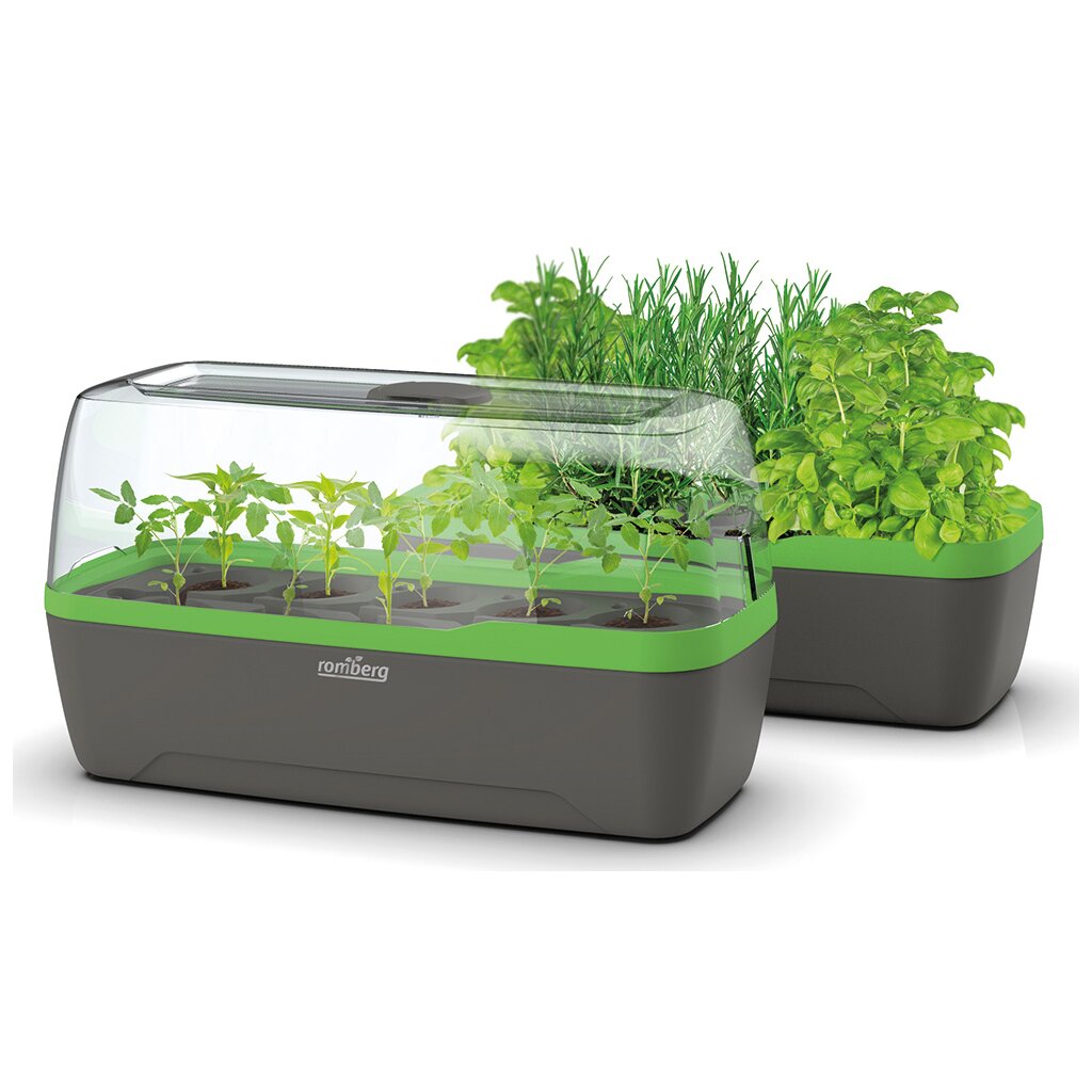 The greenhouse from the German brand Romberg is made of high-quality materials and impresses with the combination of matt and high-gloss components. The crystal-clear polycarbonate hood is very stable and unbreakable.